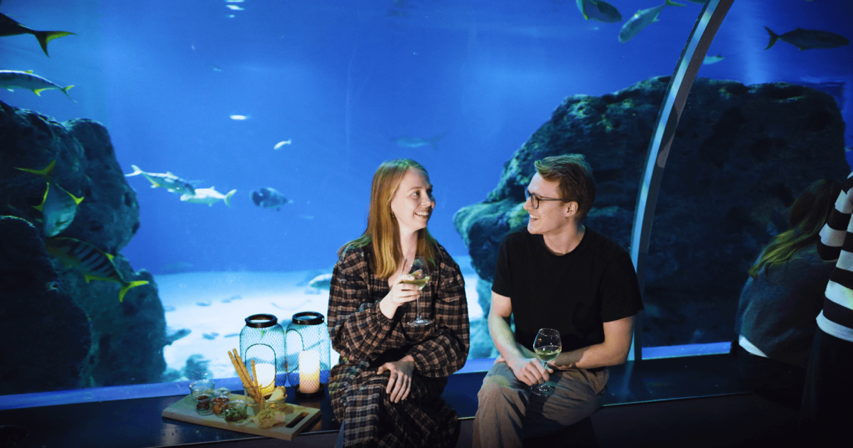 Stroll through the exhibition at your own pace with a glass of wine in hand and enjoy small, delicious tapas dishes on the ocean floor, with views of thousands of colourful fish, sharks, and sea turtles gliding past the aquarium windows.